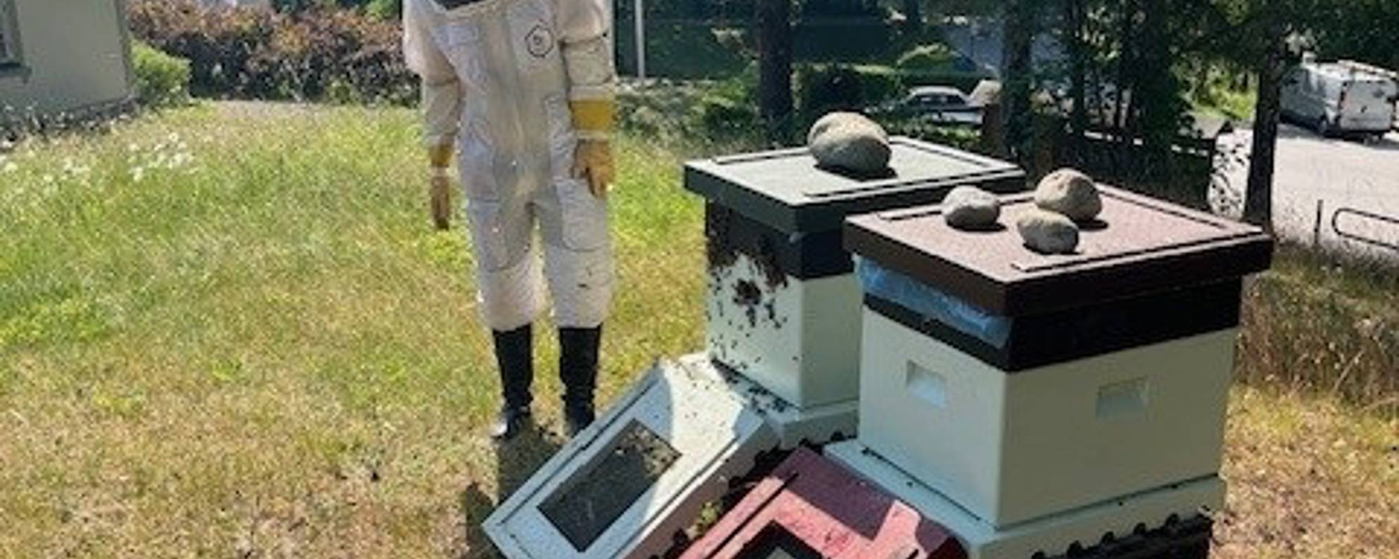 Vems är bina? I varje bikupa bor mellan 40 000 och 90 000 bin. Bikuporna hyr vi av Katja på Bi-Snack Sverige AB, som är biodlare och sköter om bikuporna och bina åt Botkyrka GK.